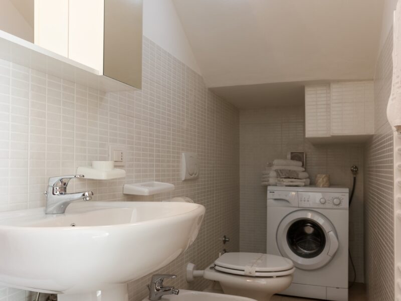 Adjacent to the living room is a small service bathroom with a washing machine and toilet.